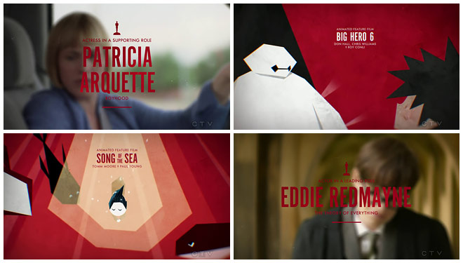We wanted to keep red, black and white as the Oscars 2015 colour palette and pay homage to the styles and illustrations with a unique Saul Bass graphic approach, simplifying the original animations into shapes and abstract forms. When we finished and presented we had a long discussion on whether or not this enhanced or took away from the craft. Luckily the producers agreed that it was a homage to the art, and the simplicity and uniform look kept it visually striking.