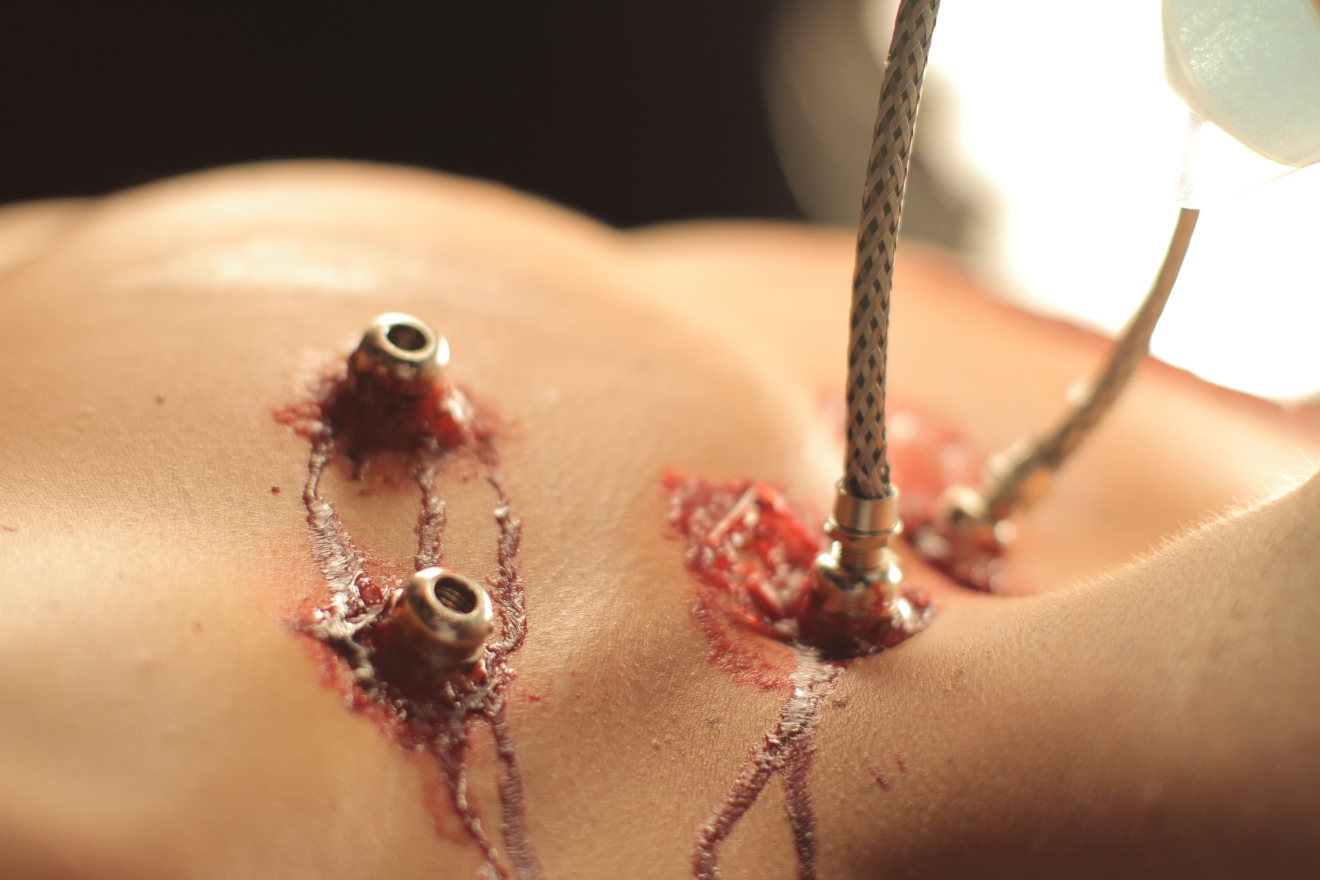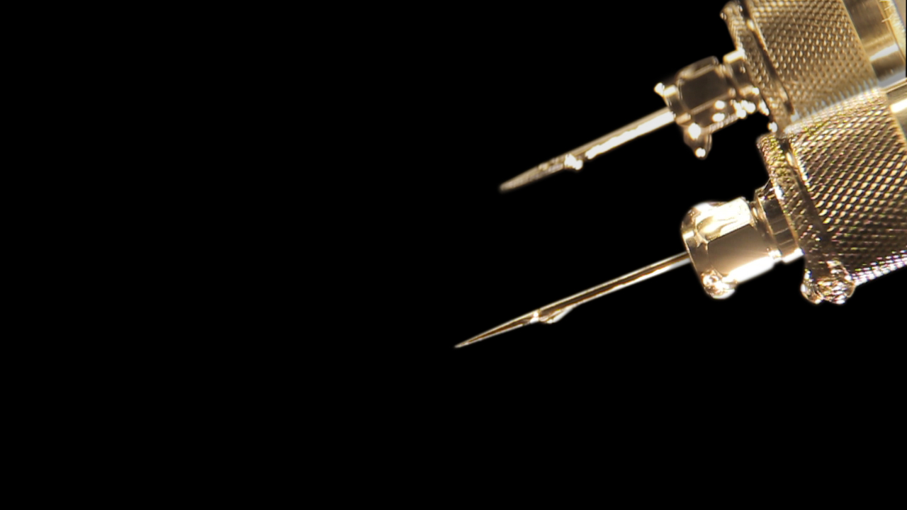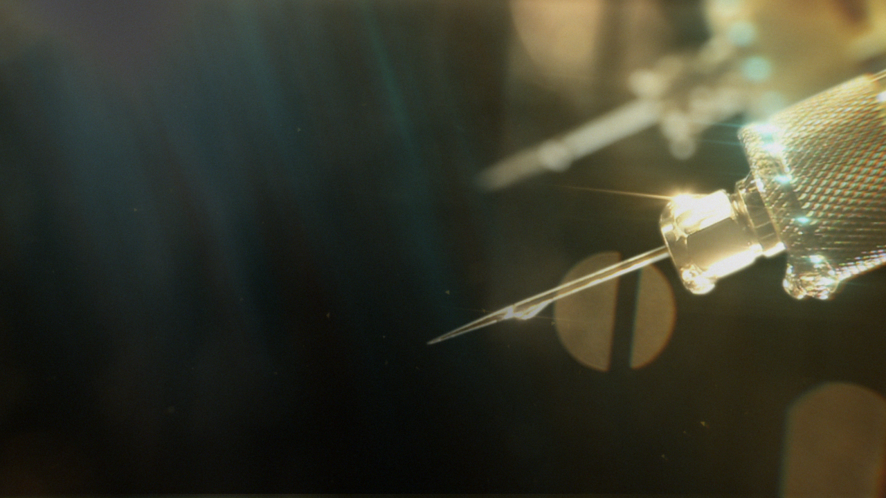 As far as putting it all together, the goal was always to seamlessly blend the CG, motion graphics, and live-action shots to create a surreal, etherized vision of the operation. I worked with Scott, our production designer, to find elements that would fit into the world already defined by the CG shots. Often, Scott created the futuristic surgical tools by taking parts from modern-day computers, household hardware, power tools, and medical supplies.
