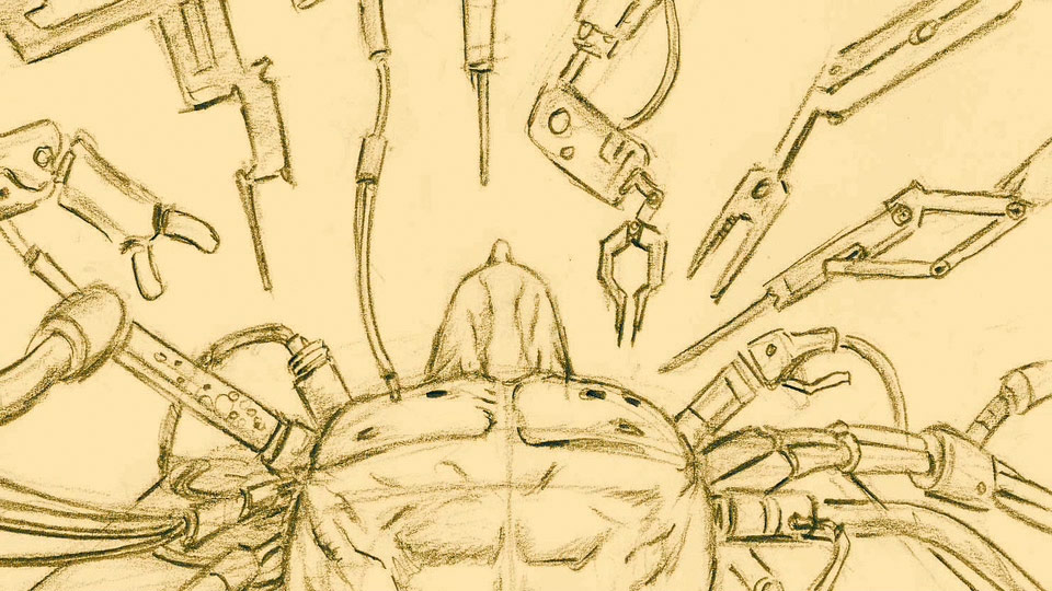 JFD: It started with us at Eidos-Montreal. We knew we wanted a sequence that would tell the story of Adam Jensen’s life being saved on an operating table. The thing is, we didn’t want anything basic or expected. We wanted something more stylish and conceptual. We talked to the guys at Goldtooth Creative and explained our idea as to the direction we wanted to take and they started to pitch really creative ideas.