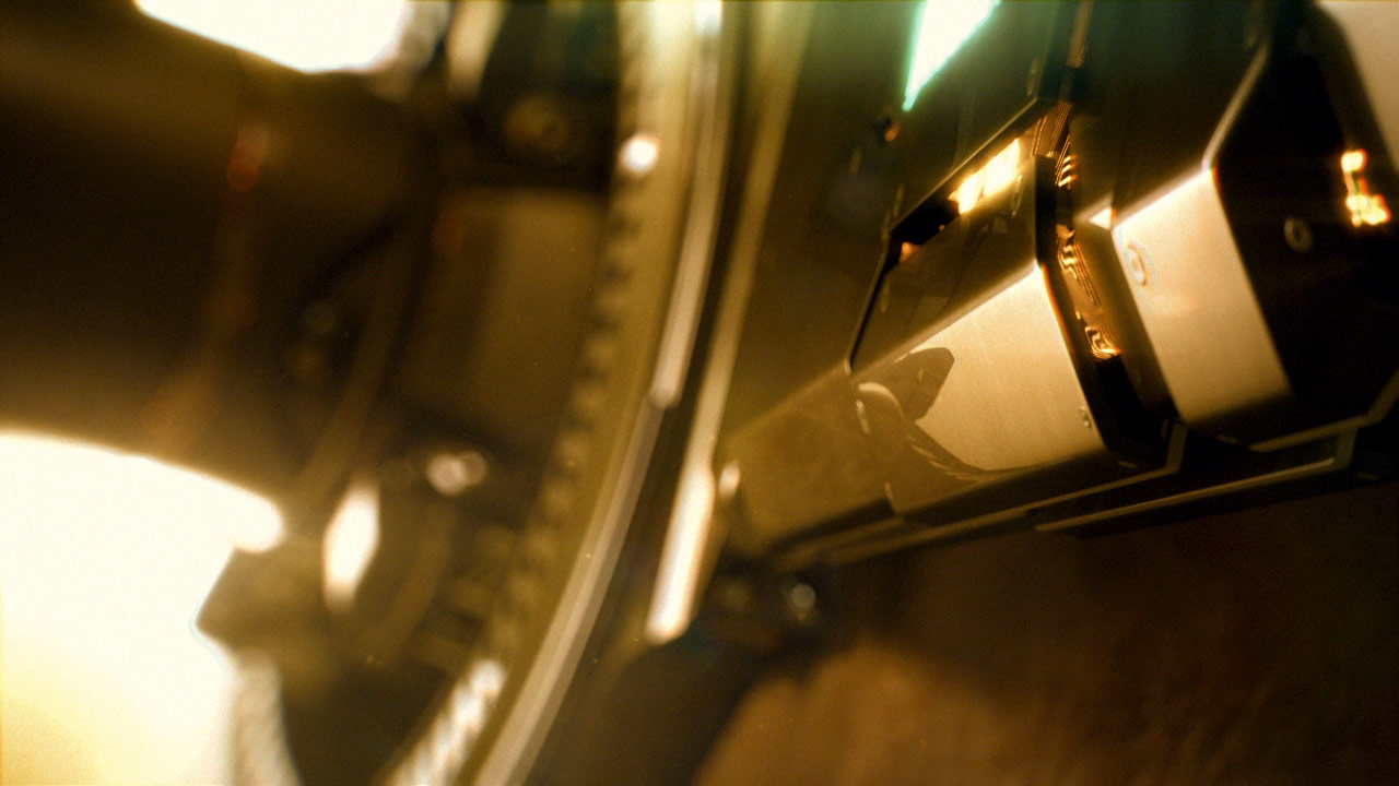 Then with Paal, our DP, we created simple rules that we would also follow when compositing the CG and motion graphics: 1) always light for the black and gold look, knowing that the blacks will be crushed in post, adding cyan accents where possible; 2) shine lights directly into the camera (there are lots of lens flares in the future!); 3) shoot with as many foreground elements as possible with very shallow depth of field in order to hide the boundary between live action and CG elements; 4) add atmosphere and particles to as many shots as possible (scenes with many layers were shot clean and the particles were added in compositing).