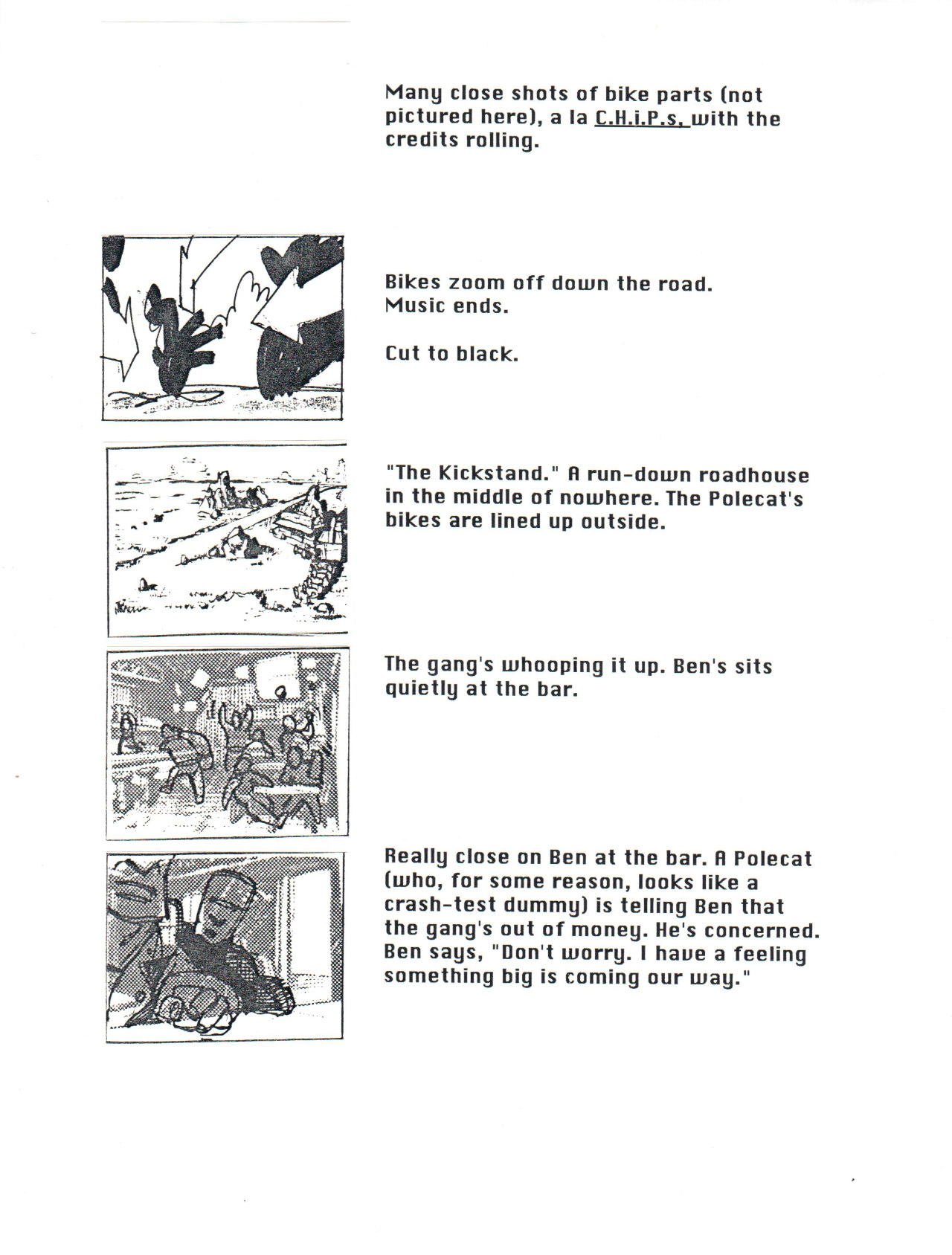 Larry: Tim had roughed out a concept for how he wanted to set it up. He worked with Peter on developing that panoramic shot that established that big, desolate world. I remember us talking about wanting to have one of those crazy biker intros where you get the camera down next to the road and it’s like a stampede flying by. We want to introduce this guys on the road, at high speed.