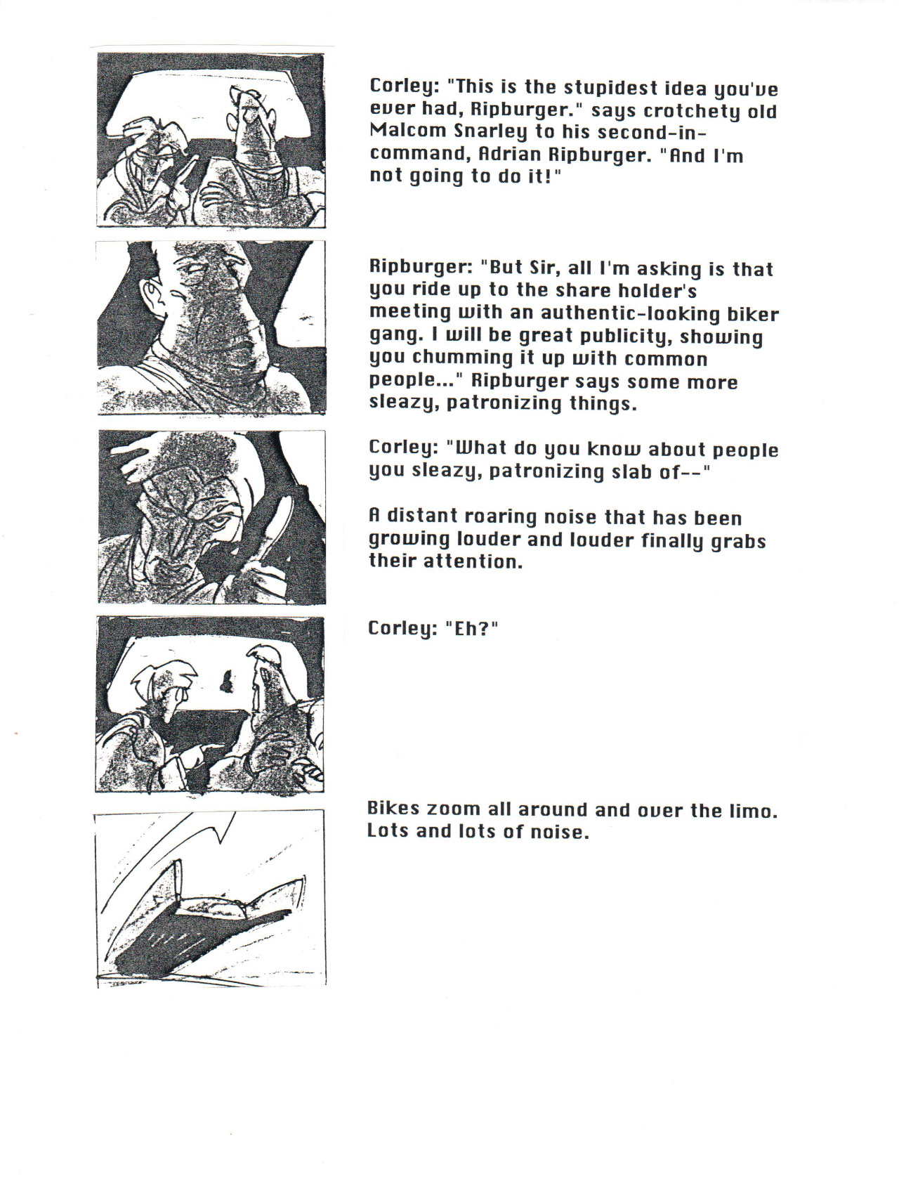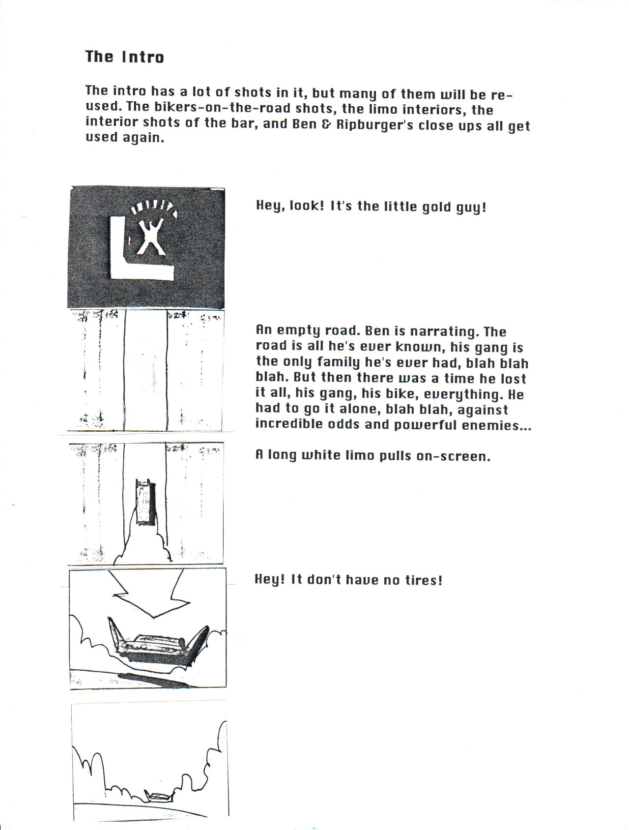 Tim: Let me see if there’s anything in my Full Throttle binder here. Yeah, I can see that I’m already defensive about the expense of it: “The intro has a lot of shots in it, but many of them will be reused.” [laughs] “The bikers on the road shots, the limo interiors, the interiors shots of the bar, and Ben and Ripburger’s close-ups all get used again.” These aren’t just wasted and thrown away, they can all come back! Things were so tight.