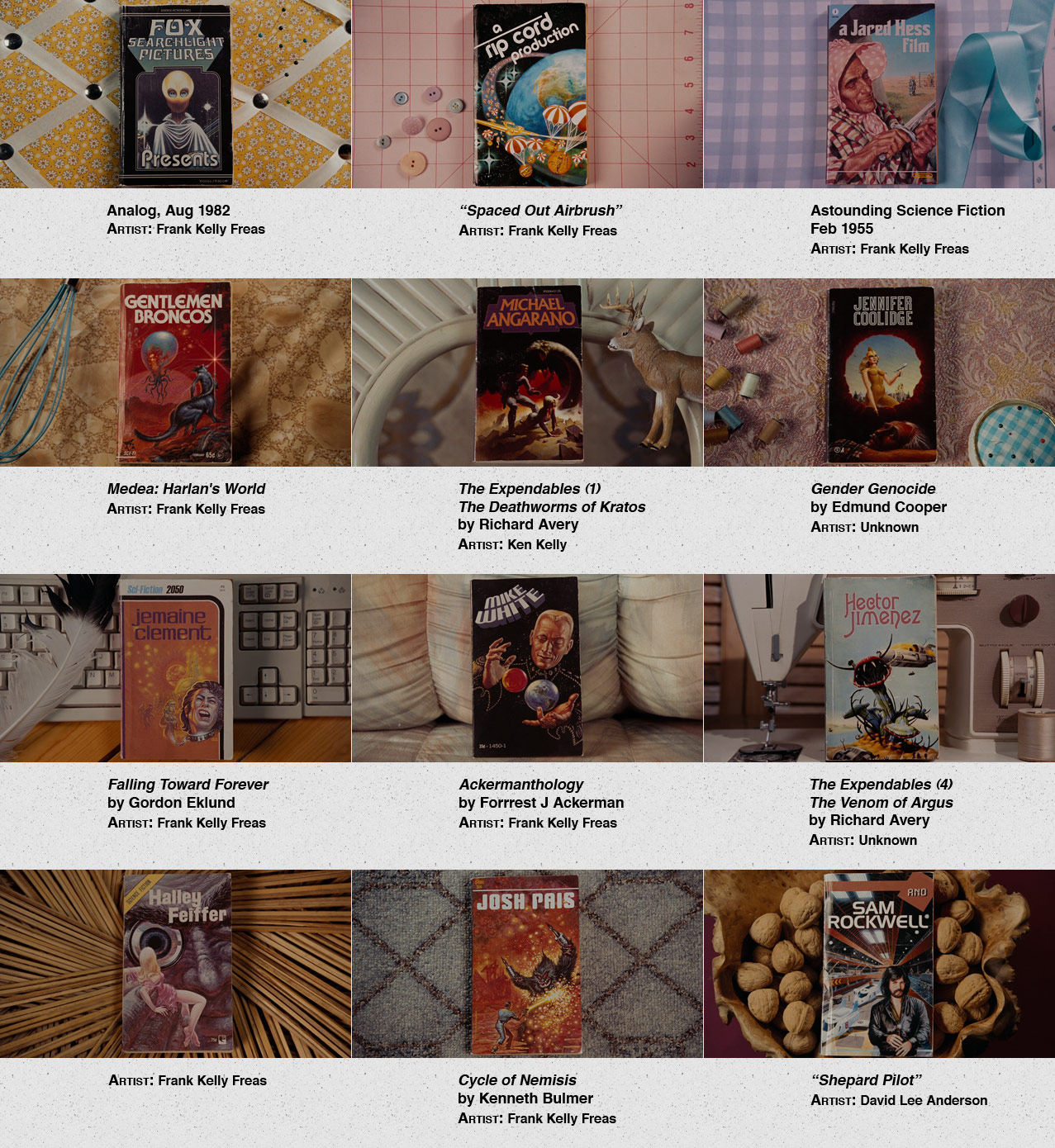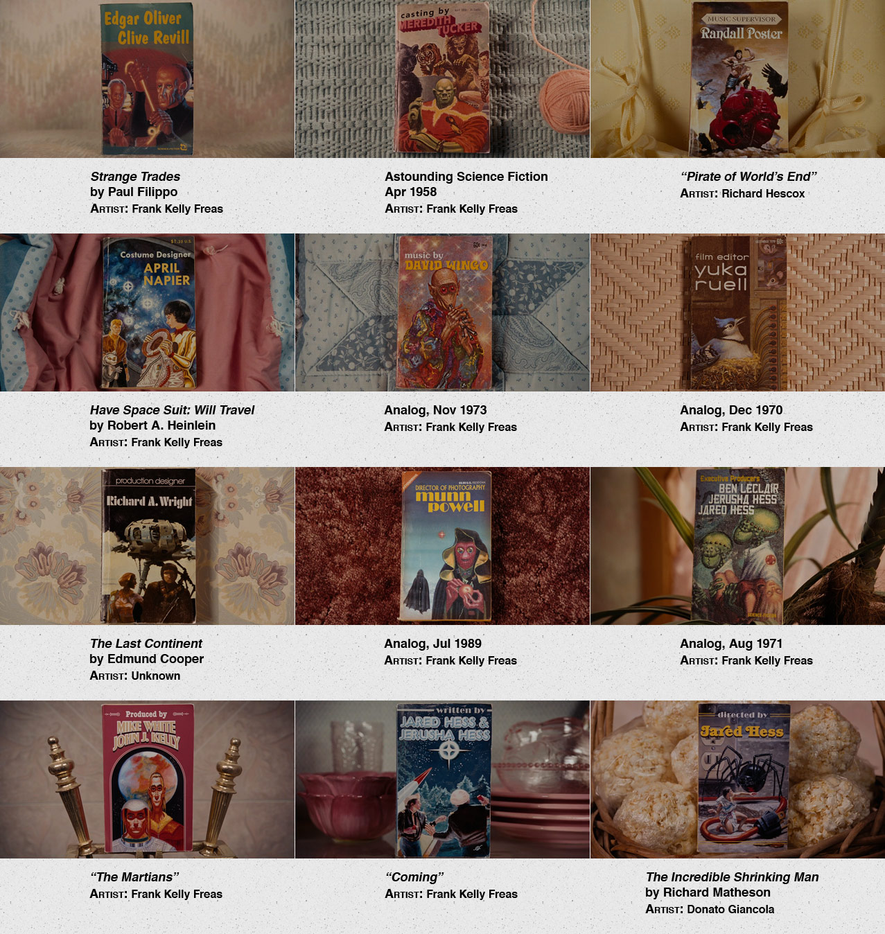 So, over the course of filming, with the help of the producer's assistant David Dilley, I scoured bookstores and the internet to figure out who had painted our favorites, which was not such an easy task. The majority of the art was not attributed to anyone and many of the publishers of the books were either out of business or had been gobbled up by larger mega-publishers over the years. The majority of the titles we managed to obtain for use are painted by the great illustrator Kelly Freas.