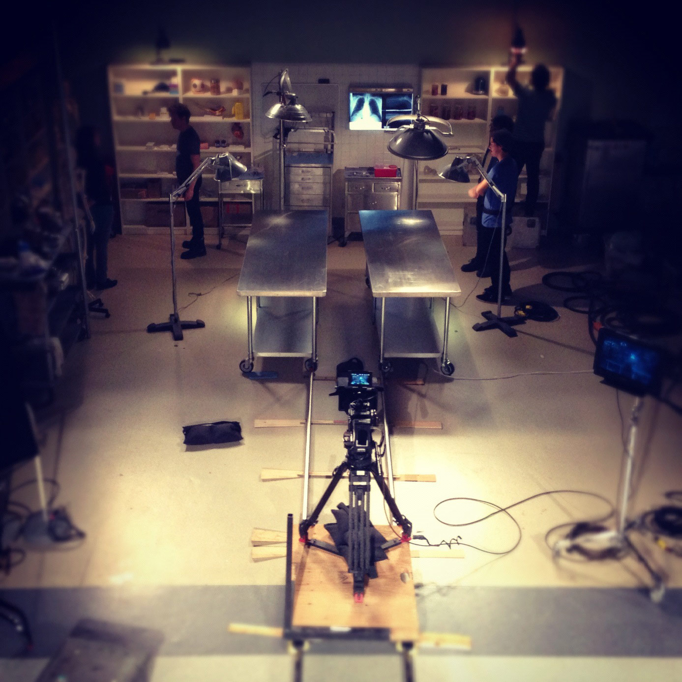 For example, the first draft of the concept had no exterior Northern Ontario shots at all. The “northern” imagery was going to reveal graphically in the medical textbooks of the students. This eventually changed to include exteriors so we ended up with the three elements: exteriors of the iconic north, the graphic component, and the medical portion. Finding the medical lab-type space that both suited our needs logistically and aesthetically was a concern since we wanted a specific look. The main unit was building a set in Sudbury but the completion date was about a week before we were scheduled to shoot, so we didn’t know whether it would suit us until the eleventh hour. In the meantime, we found a great location with some nice retro elements. Unfortunately, when they got back to us with the rental rate it wasn’t within our budget! So we eagerly waited for the set and thankfully, it turned out great.