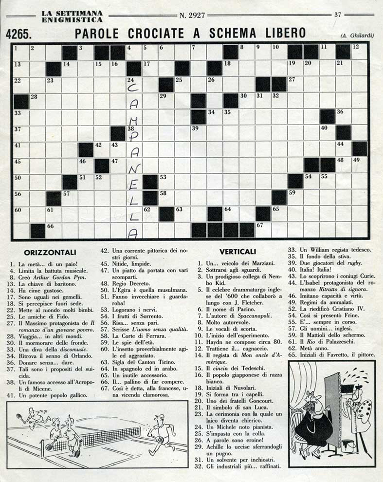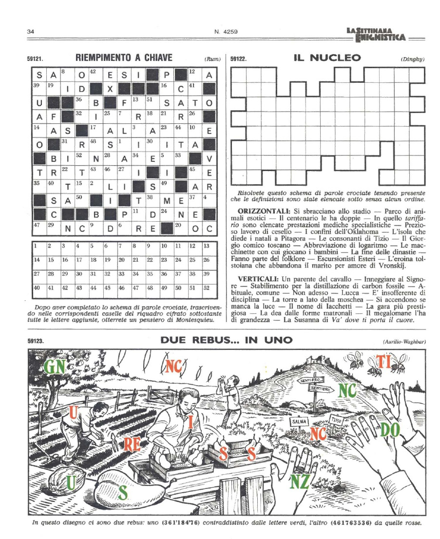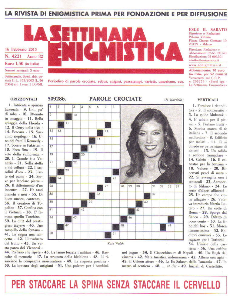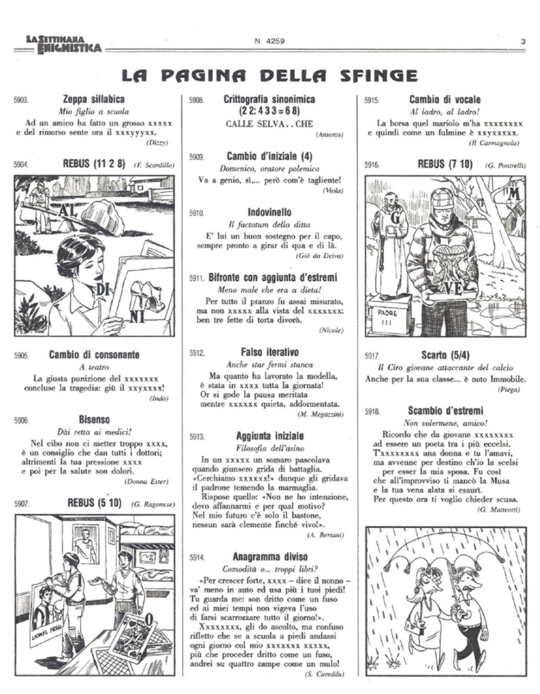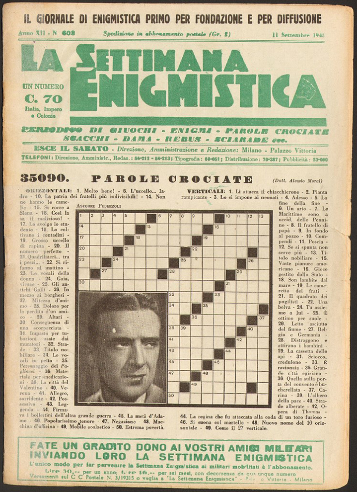 Examples of crossword and puzzle magazines, including La Settimana Enigmistica. Its cover has remained fairly consistent since 1943, included here.