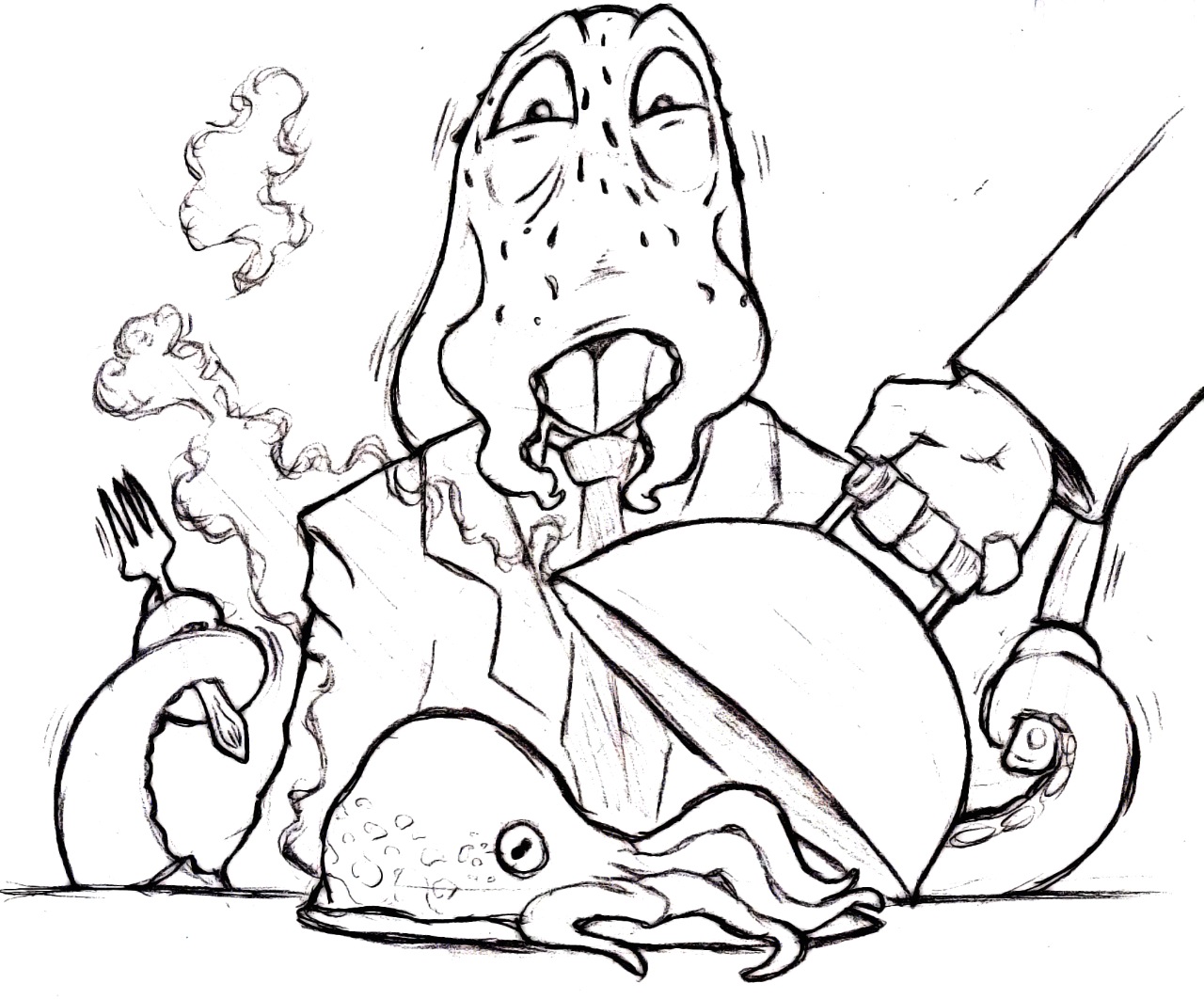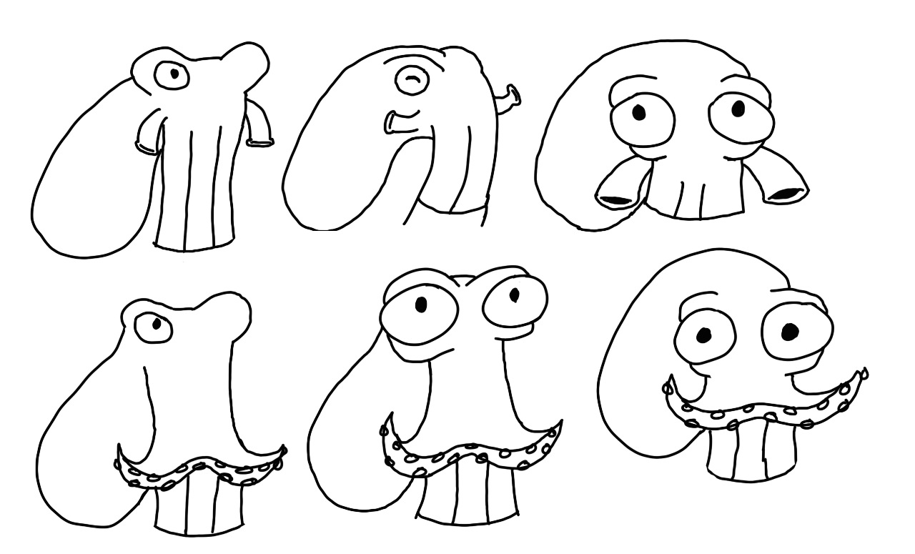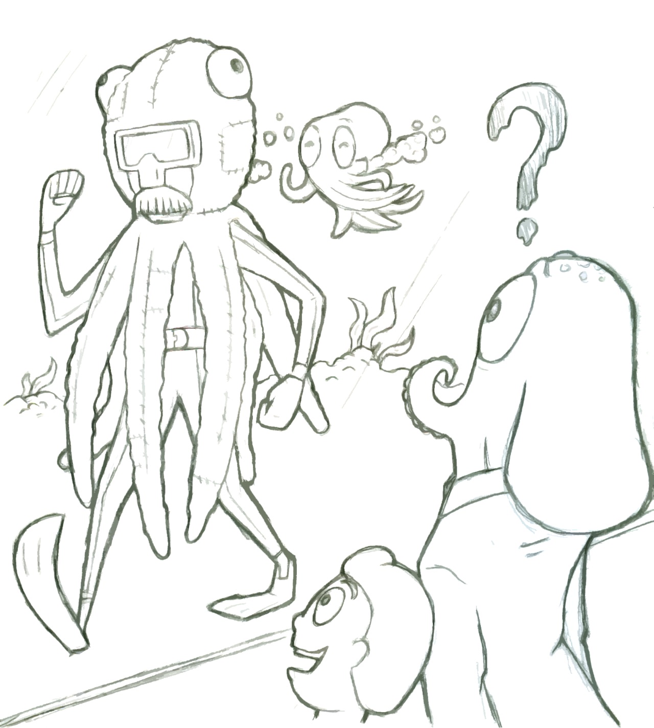 KZ: Right, in the original pitch it was an octopus in a robot human suit, but when they brought it to the larger group we decided it would be funnier if he were just an octopus.