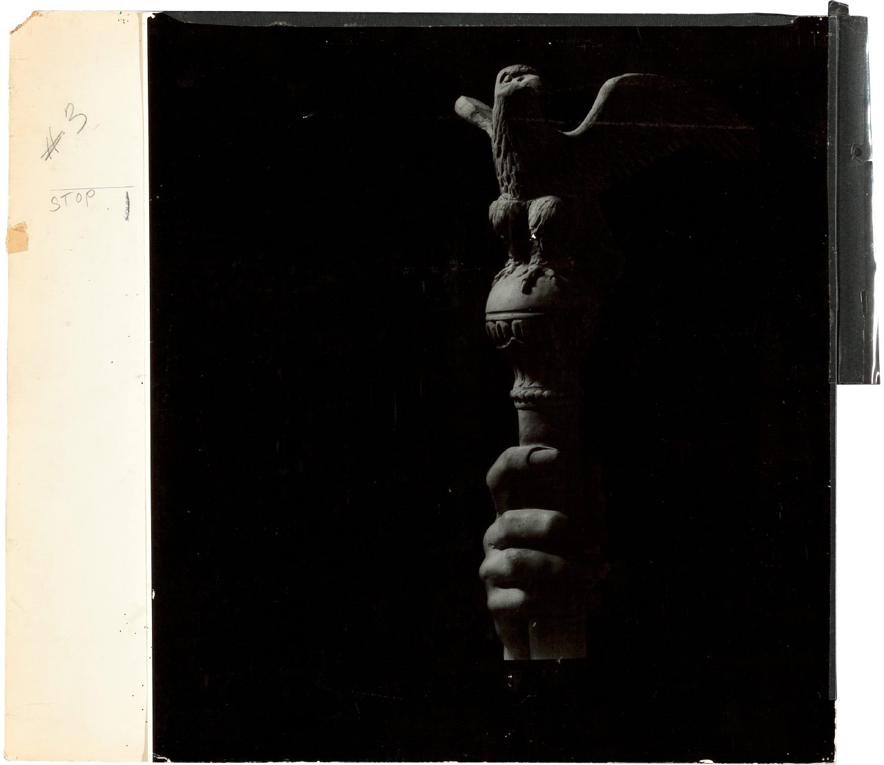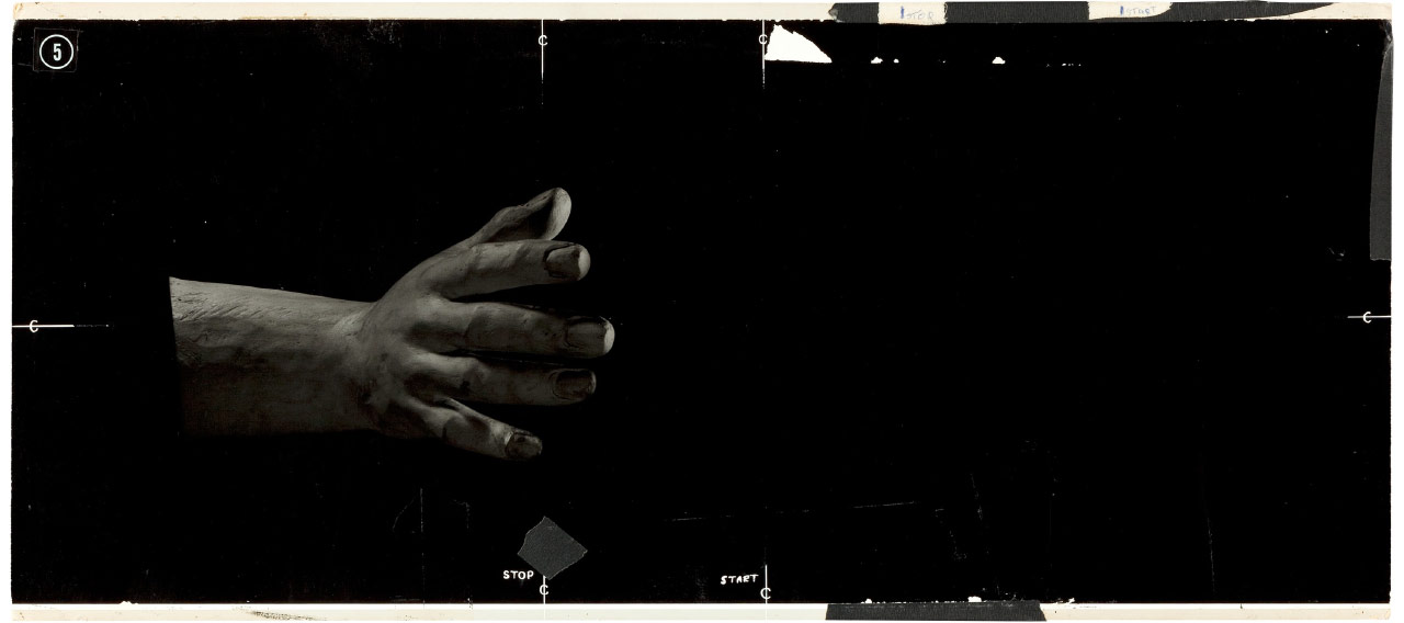But how to have the head crack open and retain the mood of slow decay? We had to think of a way of it coming apart slowly. We wracked our brains and Elaine came up with a great idea. She recalled the Japanese bunraku theater where puppeteers dressed in black manipulate the puppets. Well, Elaine put on a pair of black gloves and draped herself in black cloth. She was on-camera while it was rolling and slowly pulled chunks out of the statue, just taking them away slowly until it fell apart."