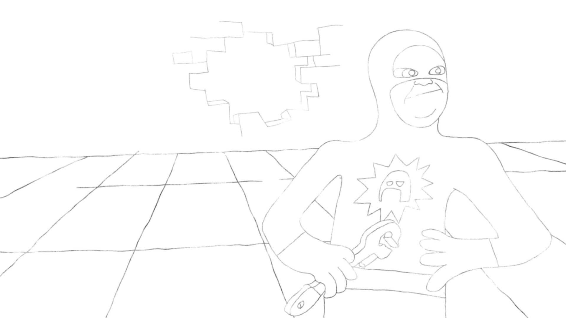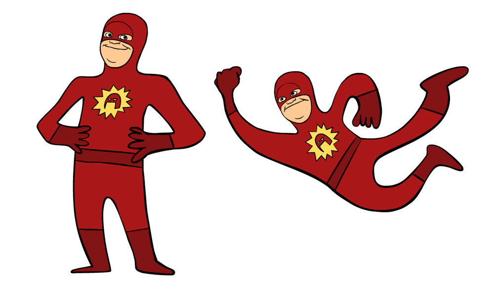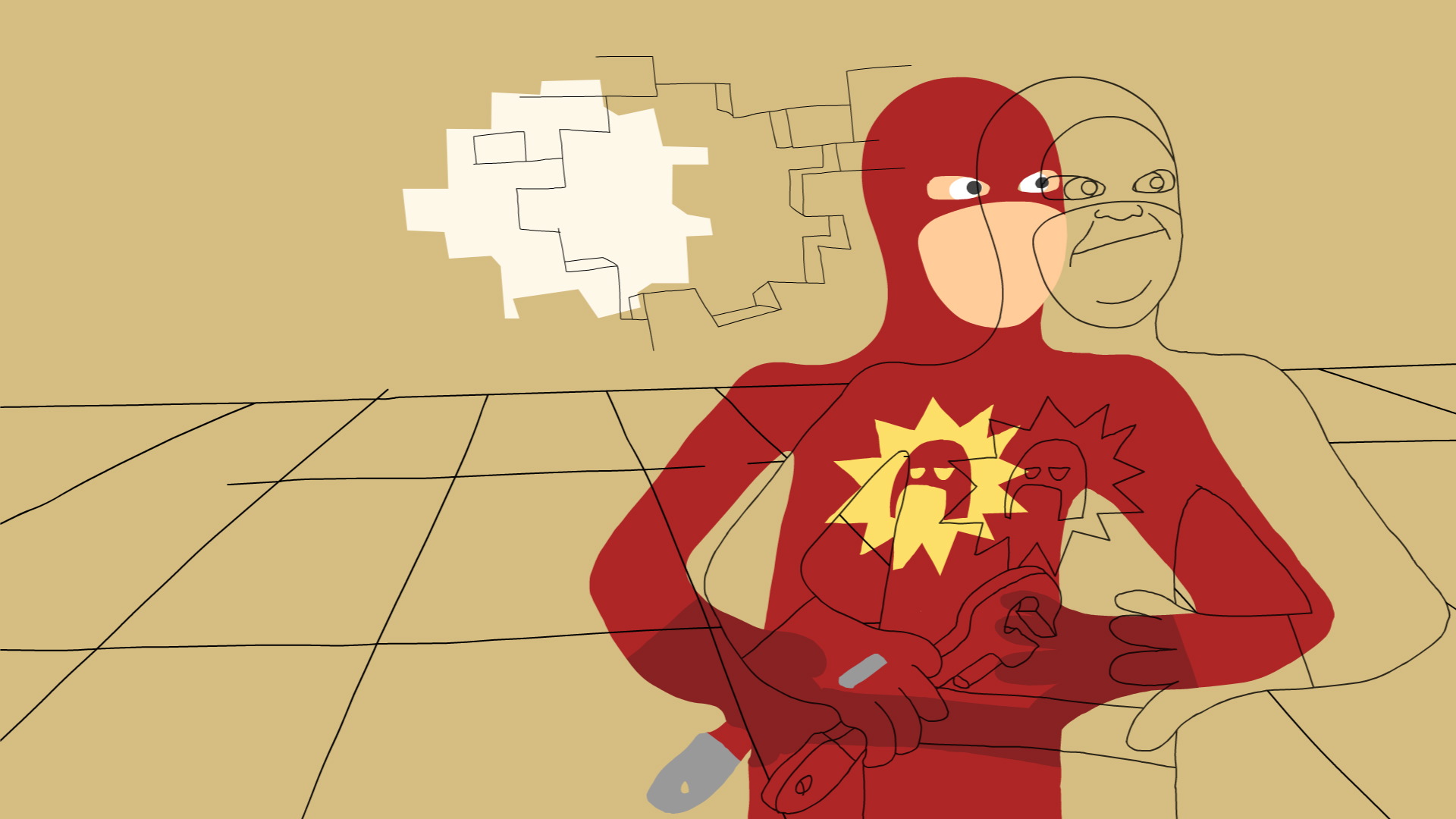 For Super, the music track already existed, a song James loved, so the slate wasn't completely blank. But I still determined the frames per beat and animated a visual beat as a guide (a red X for each beat). Once I have this visual beat as a reference I can start establishing the broad actions and mood of the story that James wanted to tell in this sequence. Crimson Bolt flies up through the clouds for 16 beats, holds heroic pose for 4 beats, 1 beat of anticipation to start flying again, and 4 beats to fly forward until his chest logo fills the screen, etc. When working with a locked music track, there will be obvious breaks and strong beats that help determine big changes in action and story. I used the high energy tempo and strong beats in the Super sequence to introduce the character roles, the intense/comic violence and the synchronised dance steps. I drew from my musical theater experience and watched a lot of musicals when this project began to help choreograph the dance moves, something I've always wanted to do in my animation career.