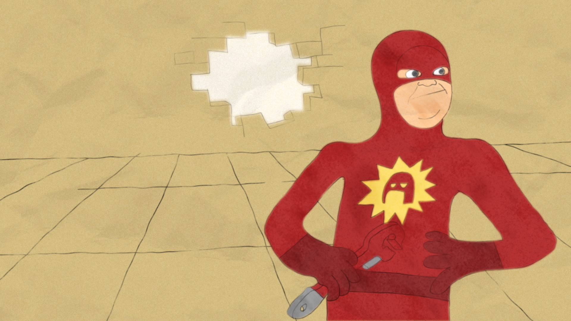 The animation is all hand-drawn but on computer tablets. In this case we animated a line layer and a separate color layer to add some After Effects filters to give it an on-paper look. We had to make some decisions early on about how we were going to use paper, do we pan across pages taped together...or use paper cut out clouds and rocks? It started looking a bit too crafty so we stuck to a mostly locked shot with different paper textures. Most of the color was done in Flash with an After-Effects noise added but to get the crayon or colored pencil look of some of the backgrounds we used custom brushes in Photoshop. Victor composited it all together using After Effects. We logged 1625 hours on Super all together.
