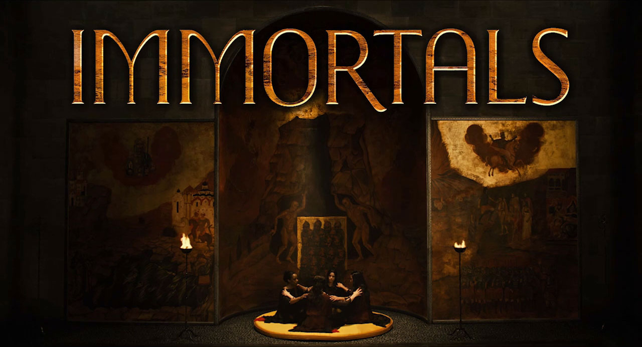 With Immortals, the title lives in the space of the Temple of the Oracles. Originally, we got introduced to the oracles in a long, slow pan as they're walking on a red circular pad. The type was meant to be a massive, somewhat menacing three-dimensional object in this room. I chose a heavy, compressed typeface that I modified to be even heavier and more compressed. Tarsem's brilliant production designer Tom Foden suggested I give it the gold brick texture of the jail of the Titans that appears early in the movie.