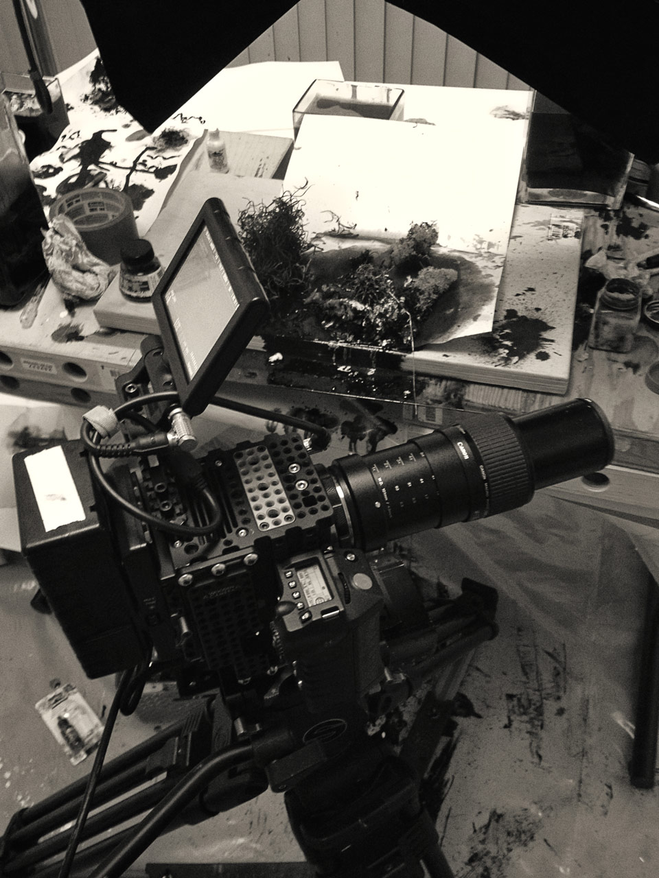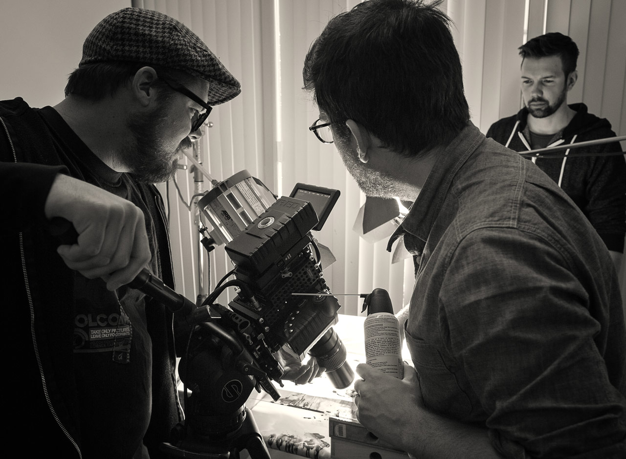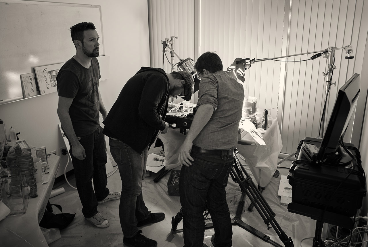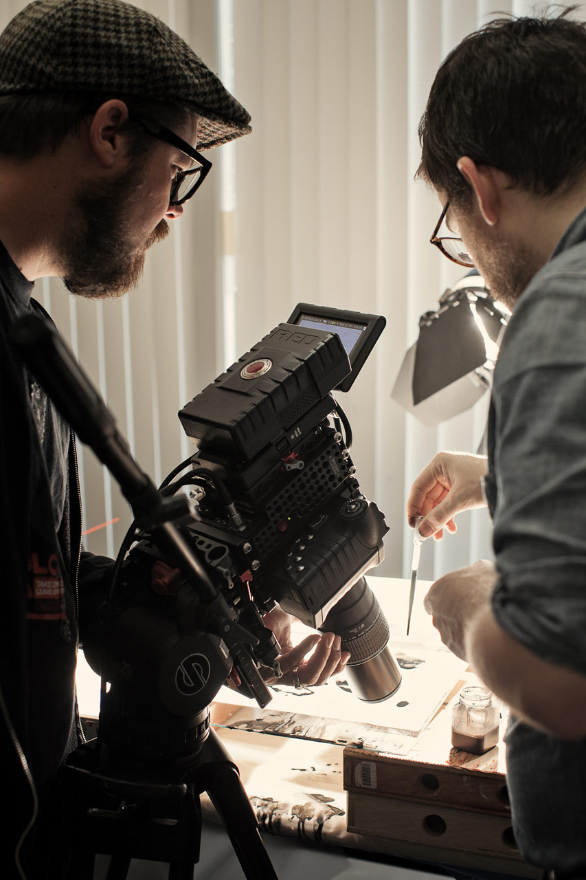 KJ: The first test was done with the 100mm macro Canon lens – the 5D Mark III, a pretty typical Canon lens – and then a Zeiss manual 100mm macro. It was just not small enough to capture the world, though. We couldn’t get enough detail to make it shallow enough to be artistic and cool and shallow enough to hide the fact that we are trying get away with doing ink on paper. The second test came a day and a half before Henry and I were going to get together – I had the Epic on site, I had both the 100mm macros in my arsenal – but it just was not working.