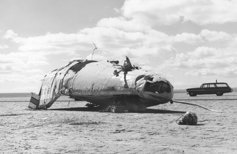 To flesh out the crash montage, Cole intercut the archival footage with shots of series star Lee Majors inside the real HL-10 cockpit. These shots were then overlaid with various elements, including blinking computer lights, flickering numbers, and a frantically sweeping radar display. To simulate the “squeeze and static” of Austin’s communications with the control tower, Cole had Majors record all of his dialogue through a real flight oxygen mask that had been rigged with a microphone. These audiovisual effects were added to make the sequence appear as though it was a computerized recording of the accident and, more generally, to ramp up the feeling of tension.