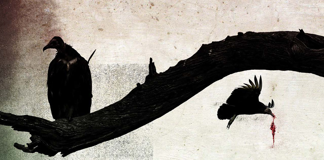 Angela: Edgar Allan Poe is a huge literary hero of mine, but even if I didn't know there was a Poe influence on the pitch for this sequence, I would've picked this concept because I was immediately struck by the graphic novel-esque feel to the images and I loved that it evoked a sense of classic, American gothic horror. The idea of The Raven in the form of the flock of crows really worked organically for our story, and there's just a nice general macabre feel which we also undercut with images of greenness and growth – I like the tension that exists between those extremes. It feels very right for our story.